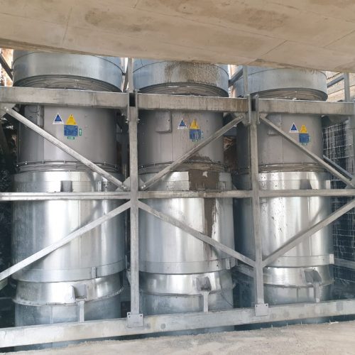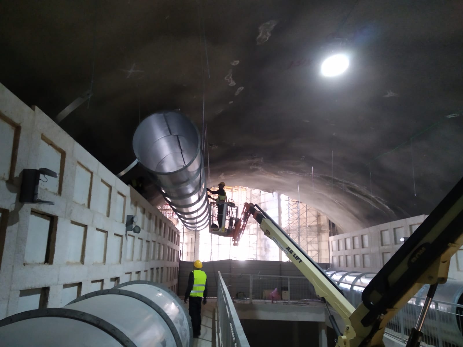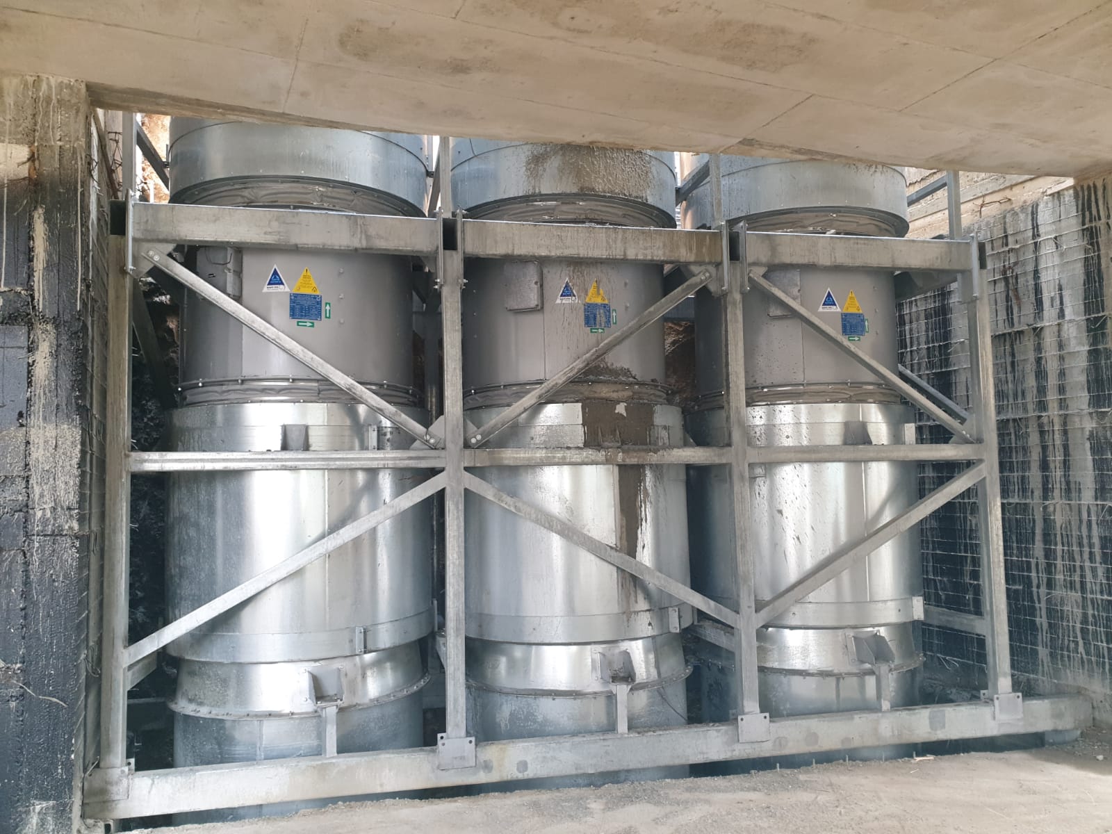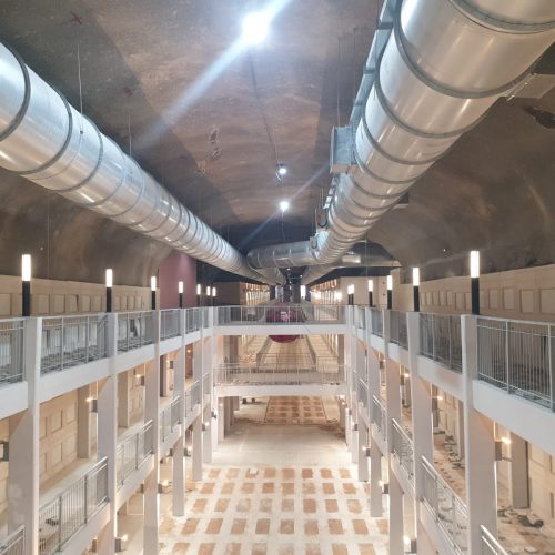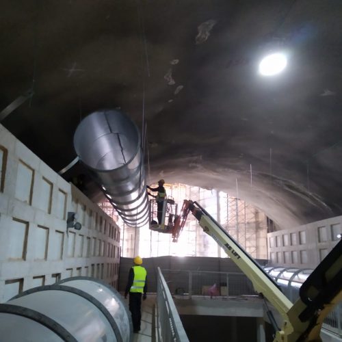 Maximum flow about 500,000 m³/h, strict acoustic requirements, working height between 14 and 17 meters, suction piping, three branches each 1,500 mm in diameter, general length of the piping about 800 meters, each branch contains suction shutters and dampers Smoke for emergency.